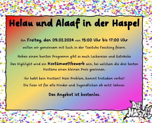 wollen wir gemeinsam mit Euch in der Teestube Fasching feiern.