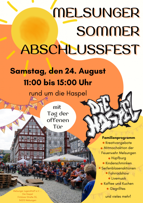 Am Samstag, den 24. August 2024 findet rund um die Haspel das Melsunger Sommer Abschlussfest mit Tag der offenen Tür statt.