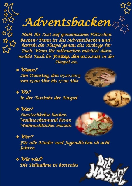 Habt Ihr Lust auf gemeinsames Plätzchen backen? Dann ist das Adventsbacken und -basteln der Haspel genau das Richtige für Euch.